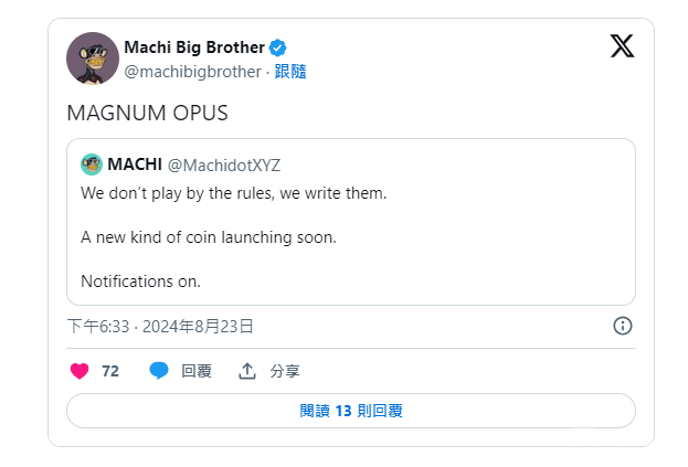黃立成在crypto和NFT領(lǐng)域早已是知名人物。今年3月,他在Solana網(wǎng)絡(luò)上推出了迷因幣$Bobaoppa,成功吸引了廣泛關(guān)注。此次,他選擇在Blast鏈上發(fā)行新幣$MACHI,顯示出他對(duì)不同Blockchain網(wǎng)絡(luò)的深厚興趣和不斷探索的精神。