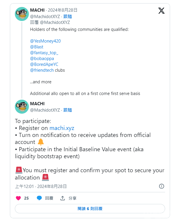 盡管Tokens的詳細(xì)發(fā)行機(jī)制尚未完全公布,$MACHI官方表示,持有YES、Blast、Fantasy.Top、Bobaoppa、BAYC、friend.tech等社群的用戶將有資格獲得初始Tokens分配。想?yún)⑴c的用戶需在官網(wǎng)注冊(cè),并關(guān)注官方公告以獲取最新信息,參與下周的初始基線值(Initial Baseline Value)活動(dòng),即所謂的流動(dòng)性引導(dǎo)活動(dòng)。