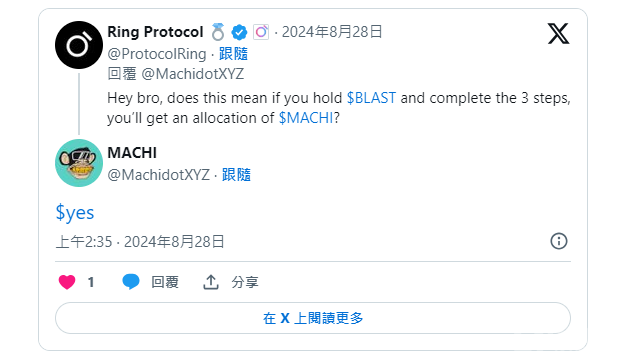 針對(duì)Blast鏈上的DEX項(xiàng)目Ring Protocol的詢問,MACHI官方確認(rèn),只要持有$BLAST并完成指定的三個(gè)步驟,用戶將能夠獲得$MACHI的Tokens分配。這一消息進(jìn)一步提升了Blast鏈在社區(qū)中的關(guān)注度。