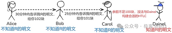 之后的事情不難想象:Carol把密鑰R告訴Bob,拿到101塊錢;Bob再把密鑰R告訴Alice,拿到102塊錢。我們觀測所有人的得失,可以看出Alice失去102塊錢,Bob和Carol凈賺1塊錢,Daniel得到100塊。這里面Bob和Carol賺的1塊錢就是它們從Alice那抽的手續(xù)費。