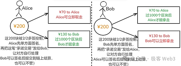這里我們要注意:這筆承諾交易是Bob主動構(gòu)造的,其中條件對Alice不利,Alice只能接受/拒絕,我們要想辦法留給Alice一些自主權(quán)。在支付通道的設(shè)計中,只有Alice自己能把“對自己不利”的承諾交易放到鏈上觸發(fā),這是因為承諾交易要湊足2/2多簽,Bob在本地構(gòu)造交易后只有自己的簽名,沒有Alice簽名。