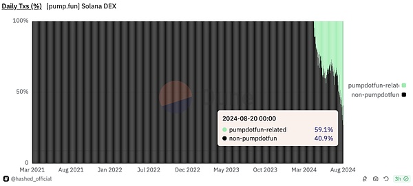 Pump.fun的影響力可以通過其相關Tokens在DEX上的主導地位來觀察,目前這些Tokens占交易量的約60%。然而,雖然輕松發行Tokens對用戶有利,但也吸引了不良行為者。根據Protos.com的數據,在170萬個memecoin中,只有41個達到了并維持了較高的市值,這意味著"成功"的幾率接近0.00002%。