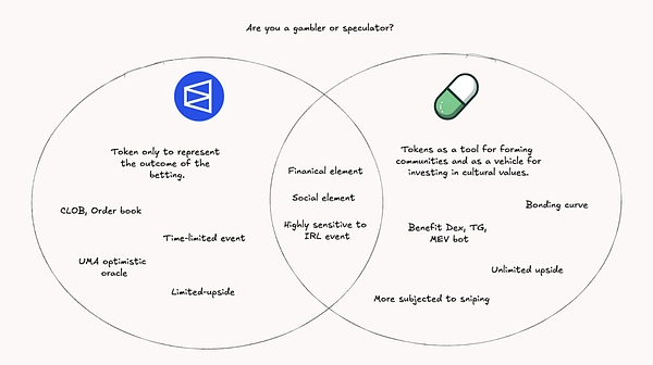 Polymarket是一個允許用戶通過下注來推測現實生活中事件結果的平臺。相比之下,Pump.fun是一個Tokens啟動器,允許任何用戶為各種目的"Tokens化"任何事物,包括賭博現實生活中的各類事件、各種meme各種注意力經濟。