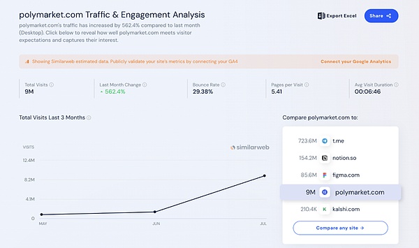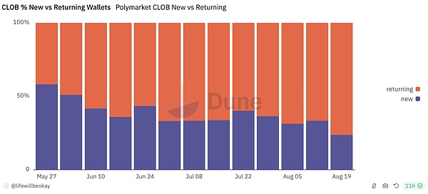 除了評論區,該主題的百分比經常被用作不同媒體關于選舉相關新聞的頭條,這反過來吸引了更多用戶加入該平臺。僅在上個月,Polymarket就吸引了65,000名新用戶,由于更多有關頭條新聞的市場出現,隨著選舉關注度的增加,預計增長將繼續。