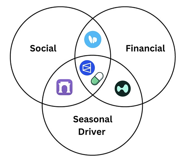 金融元素為協議提供了它需要的"價值",以啟動參與經濟并讓用戶堅持使用該系統。社交元素在現有金融元素的基礎上提高用戶粘性,創造一個不斷拉新的社區。季節性驅動因素推動了已經在社交和金融元素方面表現出色的協議的持續增長。