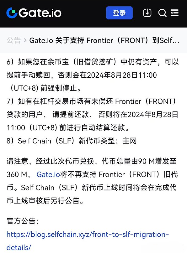 8 月 30 日,幣安宣布 Frontier(FRONT)Tokens置換及品牌升級(jí)為 Self Chain(SLF),所有 FRONT Tokens按 1:1 置換為 SLF Tokens。但該公告引發(fā)社區(qū)不滿,原因是 FRONT 在置換改名的同時(shí)Tokens數(shù)量增發(fā) 4 倍,從 9000 萬(wàn)枚增至 3.6 億枚,而置換補(bǔ)償仍按原比例,投資者Tokens價(jià)值被稀釋。同時(shí),幣安公告未及時(shí)披露增發(fā)信息也被指責(zé)。
