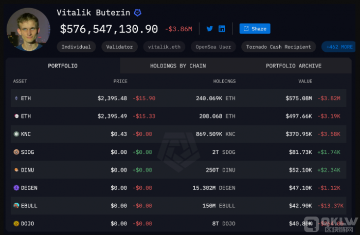 根據Arkham的數據,Vitalik當前持有的加密資產總值約為5.76億美元,其中大部分為Ethereum,持有約24萬枚ETH,現值約5.75億美元。Lookonchain日前指出,Vitalik曾在三年前表示他持有32.5萬枚ETH,如今已減少了8.5萬枚,持倉縮水了26.15%。
