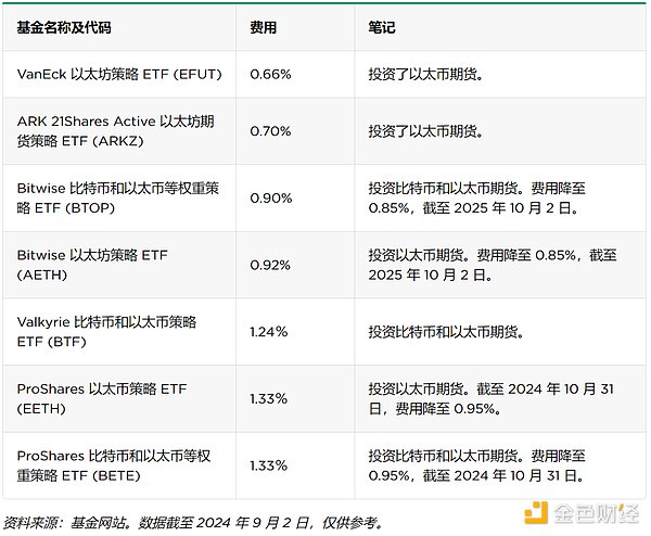 我們將Ethereum策略ETF定義為任何將至少50%的資產(chǎn)投資于以太幣期貨的ETF。目前市場(chǎng)上有七只此類基金,它們的費(fèi)用從低到高依次列在下面。