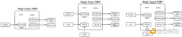 首先,Alice作為創建者發起一個PSBT交易,多簽的UTXO作為輸入,輸出是三人各自的錢包地址。由于PSBT保證了除該交易外的任何交易都不能調用任何一人的簽名,所以Alice可以簽完名后發給Bob。