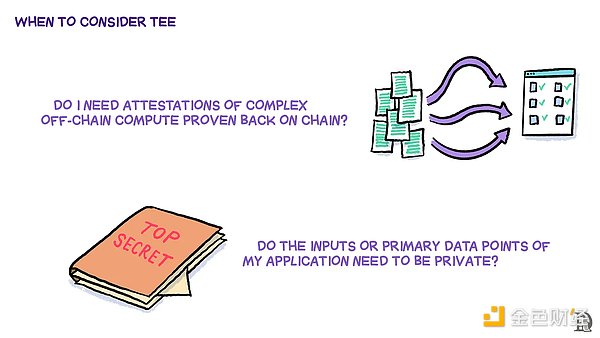 TEE并無這些限制。雖然TEE的速度比普通處理器慢,但它們仍然比Blockchain快上幾個數量級。此外,TEE本身具有隱私保護功能,默認情況下會對所有處理過的數據進行加密。