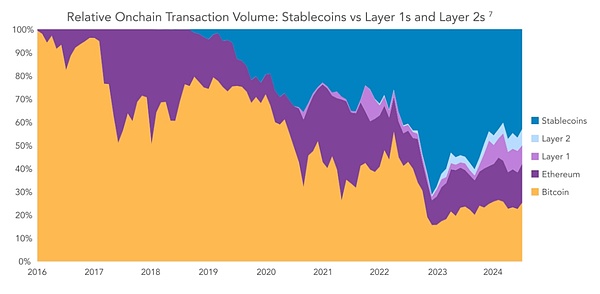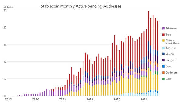 穩定幣,作為Blockchain上流通的法定貨幣Tokens化表示,無疑是迄今為止加密市場的“殺手級應用”。目前有超過1600億美元的穩定幣在流通,遠高于2020年的數十億美元。每個月有超過2000萬個地址在公共Blockchain上進行穩定幣交易。在2024年上半年,穩定幣結算的價值超過2.6萬億美元。