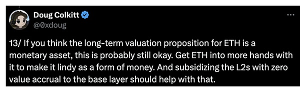 如果有未來(lái)L2生態(tài)繁榮的一天,作為具有網(wǎng)絡(luò)效應(yīng)的ETH,即使不一定具有壟斷效應(yīng),仍能獲得增量帶來(lái)的采用上的巨額回報(bào),屆時(shí)Ethereum將逐漸奠定以ETH資產(chǎn)為主導(dǎo)的價(jià)值形式。