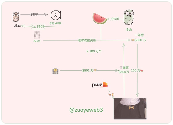 2.Bob是開西瓜攤的,為了賣更多的瓜,他現(xiàn)在允許Alice拿著理財(cái)證明來(lái)這吃$5的瓜,一年后Bob憑票兌換理財(cái)產(chǎn)品的5美元。