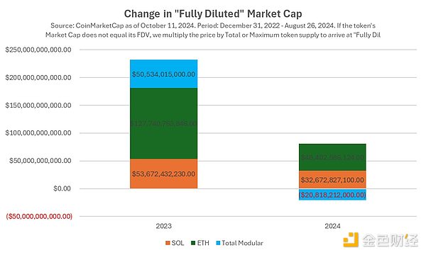 然而,2024年的情況并非如此。SOL和ETH繼續(xù)增長(zhǎng)(盡管增長(zhǎng)幅度不大),而模塊化Blockchain的市值卻在整體下降。這可能是市場(chǎng)在2024年對(duì)Ethereum模塊化戰(zhàn)略的價(jià)值失去了信心,也可能是來(lái)自Tokens解鎖的壓力,當(dāng)然,還可能是市場(chǎng)對(duì)購(gòu)買一籃子Tokens做多Ethereum相關(guān)基礎(chǔ)設(shè)施的心理成本不堪重負(fù),相比之下,他們只需購(gòu)買一個(gè)Tokens就可以做多Solana技術(shù)生態(tài)。