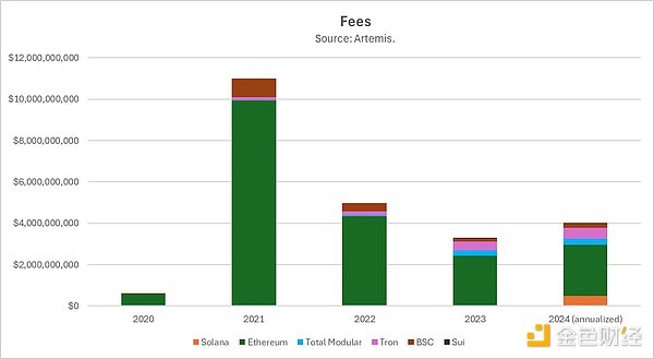 如果把Ethereum及其模塊化生態(tài)的市值加在一起看,情況會(huì)發(fā)生變化。2023年,Ethereum模塊化基礎(chǔ)設(shè)施Tokens產(chǎn)生的價(jià)值與整個(gè)Solana的價(jià)值差不多,都是500億美元。但在2024年,這些Tokens的整體表現(xiàn)不如Solana。此外,這些Tokens的收益主要?dú)w團(tuán)隊(duì)和早期投資者所有,而非ETHTokens持有者。
