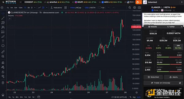 Clanker是由dish和proxystudio.eth開發(fā)的AIAgent,其原生Tokens為$CLANKER,目前市值$126M。Clanker已經(jīng)成為一款基于AI技術(shù)的去中心化Tokens生成平臺(tái),用戶只需在Farcaster平臺(tái)上艾特Clanker,并輸入希望創(chuàng)建的Tokens名稱,CLANKER系統(tǒng)便會(huì)自動(dòng)生成Tokens并提供對(duì)應(yīng)的Clanker.world鏈接,方便用戶查看和管理。社區(qū)甚至將其和PumpFun作為對(duì)比,還創(chuàng)建了Dune看板進(jìn)行數(shù)據(jù)分析。
