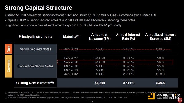 MicroStrategy籌集資金的主要方式是發(fā)行可轉(zhuǎn)換優(yōu)先票據(jù)。截至2024年第三季度財(cái)務(wù)業(yè)績(jī),該公司已通過此類票據(jù)累積了約42.6億美元的債務(wù),平均年利率為0.811%,每年的利息支出為3460萬美元。