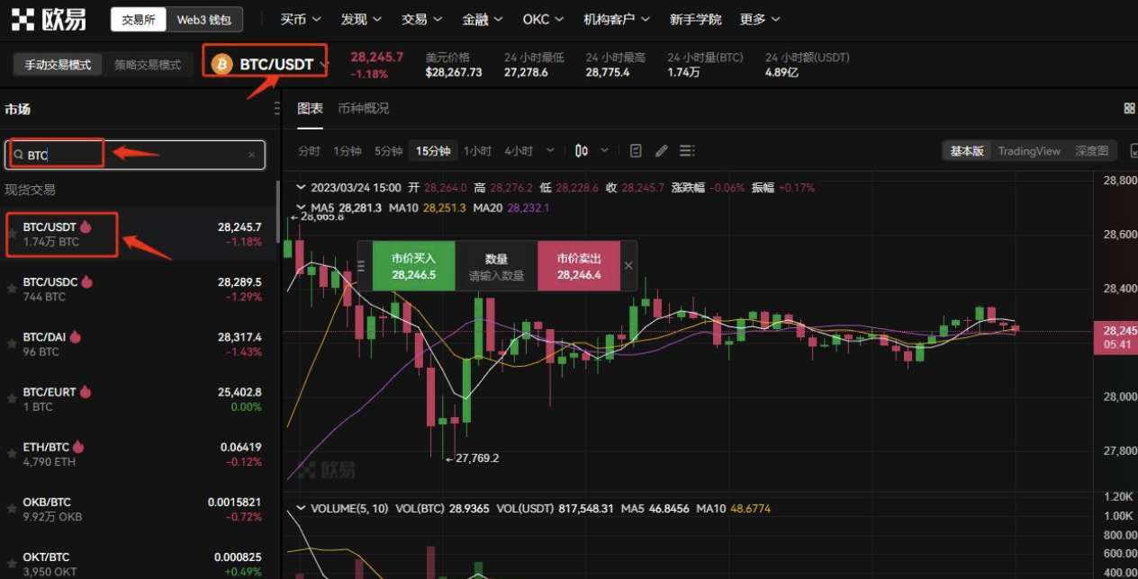 - 進入【交易】頁面,選擇BTC/USDT交易對。