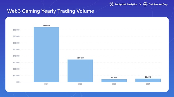Web3游戲板塊在2024年實(shí)現(xiàn)強(qiáng)勁增長(zhǎng),但相較其他加密板塊表現(xiàn)遜色。根據(jù)FootprintAnalytics數(shù)據(jù),游戲Tokens市值年末達(dá)到318億美元,較上年增長(zhǎng)60.5%。雖然該板塊在3月創(chuàng)下474億美元的年內(nèi)高點(diǎn),但仍顯著低于2021年11月創(chuàng)下的1,141億美元?dú)v史高位。