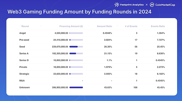 Web3游戲在2024年通過(guò)220筆融資事件籌集了9.1億美元。雖然融資金額較2023年下降7.3%,且顯著低于2021-2022年繁榮期(分別為32億美元和27億美元),但融資事件數(shù)量較2023年增長(zhǎng)48.7%,表明投資者興趣持續(xù),盡管單筆交易規(guī)模減小。