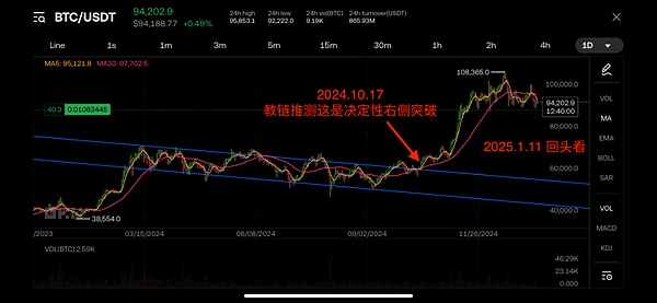 《大突破:BTC反冪律增長的另一種猜想》里的推測:「10月14號(hào)開啟的這根本周K線,很有機(jī)會(huì)成為今年初以來所構(gòu)筑的下降通道的、向上的決定性突破。拉遠(yuǎn)一些,視野放大,會(huì)看得更清楚。……目前,我們也許正處于本輪快牛周期啟動(dòng)的前夜。只差臨門一腳!