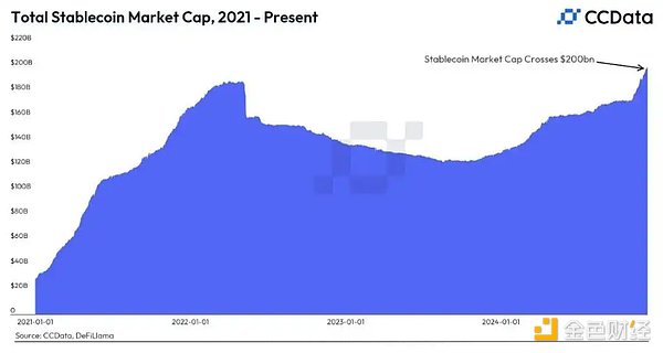 穩定幣市值在2024年達到2000億美元|圖片來源:CoinDesk
