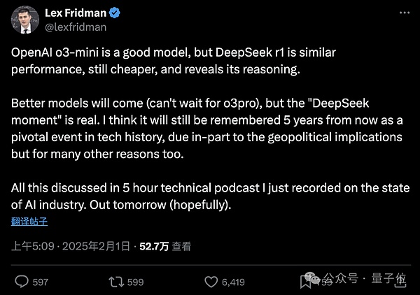DeepSeek的確很優秀,我們也會繼續研發更好的模型,但領先優勢將更小。