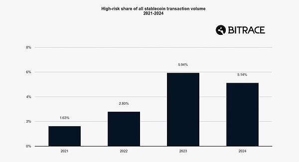 而穩(wěn)定幣,作為加密行業(yè)重要的基礎(chǔ)設(shè)施之一,已經(jīng)被這類風(fēng)險實體所廣泛采用。根據(jù)Bitrace所發(fā)布的《2025年度加密犯罪報告》,與高風(fēng)險活動相關(guān)的穩(wěn)定幣交易,占比已經(jīng)超過總交易規(guī)模的5%,對合規(guī)展業(yè)機(jī)構(gòu)以及普通投資者構(gòu)成巨大資金威脅。