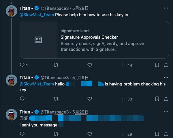 用戶在察覺異樣后并未配合,不過(guò)騙子沒(méi)有放棄,為了進(jìn)一步施壓并取信于人,騙子建議用戶去咨詢慢霧安全團(tuán)隊(duì)。一些警惕性不高的用戶,聽到對(duì)方愿意請(qǐng)安全公司驗(yàn)證,可能會(huì)因此放松警惕,誤以為對(duì)方不是騙子。而騙子則往往賭定用戶不會(huì)真的去核實(shí),甚至在行騙過(guò)程中直接 @SlowMist_Team,試圖利用安全公司為自己背書。