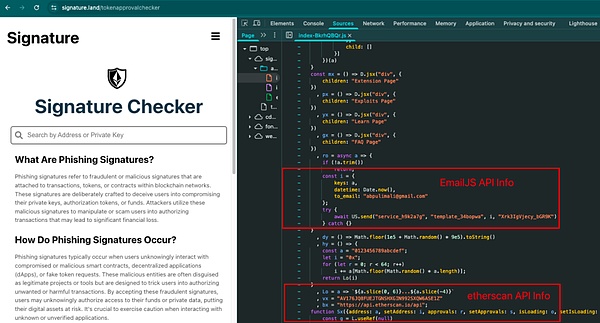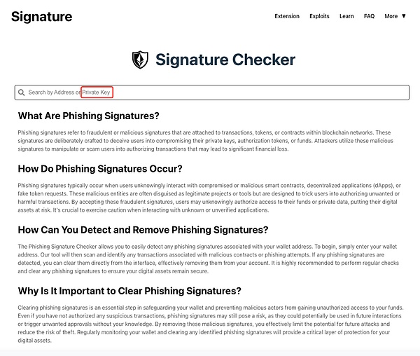 我們隨即對(duì)該工具 SignatureChecker(http://signature[.]land)進(jìn)行分析,一打開便看到,該工具竟然支持用戶輸入私鑰來(lái)查詢。本來(lái)沒(méi)有風(fēng)險(xiǎn)的地址,在這個(gè)網(wǎng)頁(yè)輸入了私鑰,也得有風(fēng)險(xiǎn)了。