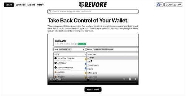 值得注意的是,這個(gè)釣魚網(wǎng)站的頁(yè)面設(shè)計(jì)和 Revoke的界面風(fēng)格、Logo極為相似,容易讓用戶誤以為是正規(guī)授權(quán)撤銷平臺(tái),從而降低警惕,增加上當(dāng)受騙的風(fēng)險(xiǎn)。下圖為Revoke的官網(wǎng)界面: