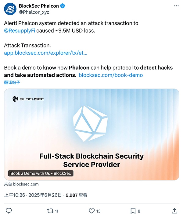 2025年6月26日02:26(UTC),項目方未果并確認無法造成更多損失后,BlockSec發(fā)布公開預警[2]。