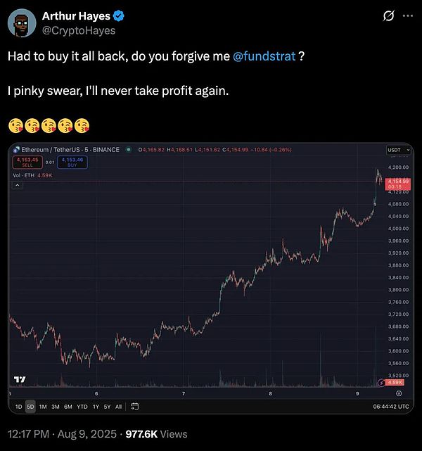 同月早些時候,他以宏觀經濟擔憂為由,在Ethereum價格接近3500美元時賣出了832萬美元的Ethereum。當ETH反彈至4150美元以上時,他重新買回,并在社交媒體上承認:“不得不全部買回來。我發誓,我再也不會獲利了結了。”
