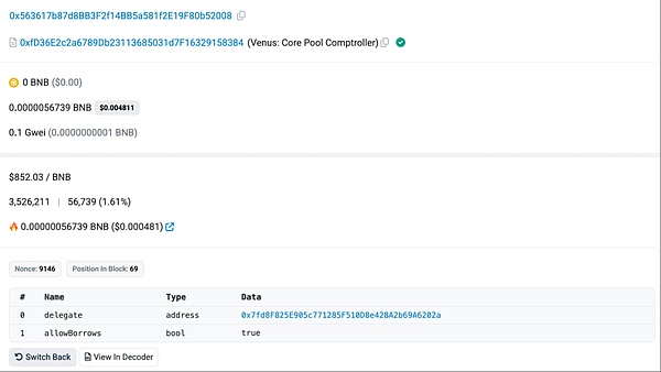 受害用戶完成委托后,攻擊者立即發起攻擊,通過 Lista閃電貸借入約285個BTCB,并動用其自有的21.18個BTCB與205,000個XRP。隨后,攻擊者為受害用戶在Venus上歸還了約306.89個BTCB與152,673.96個XRP的貸款。