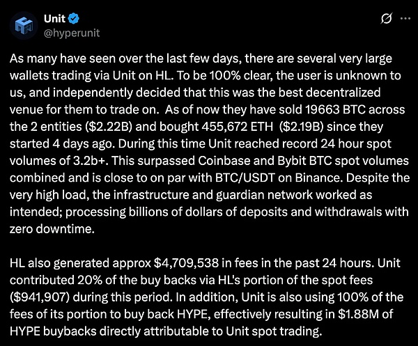 Unit項目通過提供更原生的現貨交易體驗,有力地推動了HIP-2的采用。本質上,Unit是一個多簽錢包,它允許交易者索引原生鏈并在Hyperliquid上進行無需許可的交易。(了解更多:https://docs.hyperunit.xyz/)