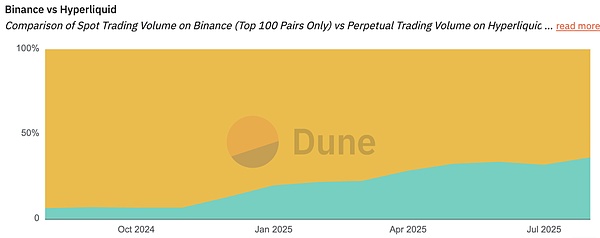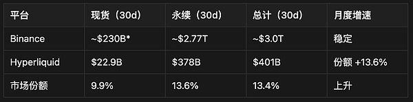 然而,將現貨交易量與永續合約交易量直接比較,就像比較蘋果和橘子。如果我們想要清晰區分幣安(Binance)和Hyperliquid(HL)在現貨與永續合約市場的實際份額,可以看到以下情況: