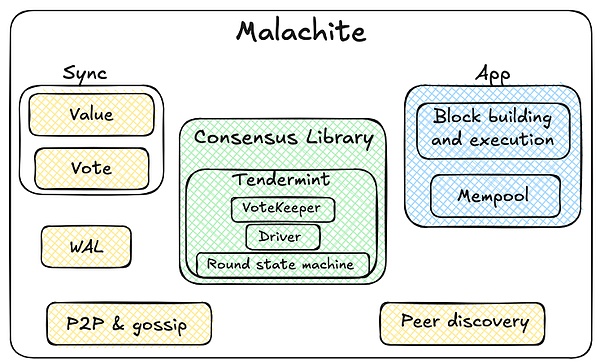 綠色標注的共識庫是Malachite的核心。其內部的輪次狀態機采用Tendermint式輪次機制(提議→預投票→預提交→提交)。投票守護器負責聚合投票并追蹤法定票數。驅動器隨時間推移協調這些輪次,確保即使部分節點延遲或故障時協議仍能持續決策。該共識庫具有刻意設計的通用性:以抽象方式處理"數值",使不同類型應用程序均可接入。