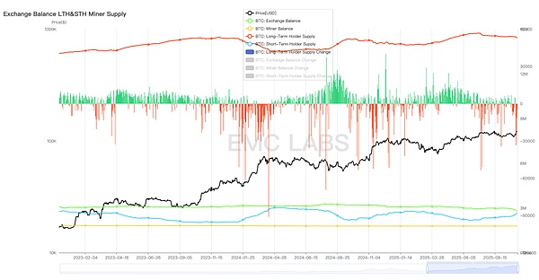 在這一階段及之后,這種流出仍在持續,它顯示出BTC這一資產目前正處于歷史性的換手之中。早期投資者(包括7年以上的持有群體)正在兌現巨額利潤退場,而傳統資金正在轉變為這一資產的長期投資者。早期投資者的行為受減半周期影響非常大,而DATs公司似乎傾向于持續買入長期持有,BTCSpotETF通道的持有者行為則受美股走勢影響更大。