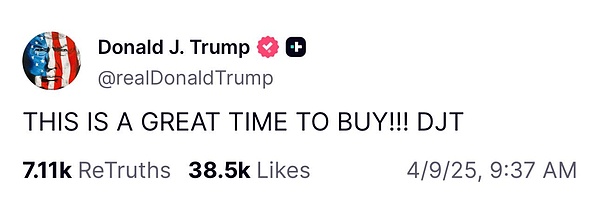 四小時后,他宣布暫停對大多數國家征收的最嚴厲關稅。道瓊斯指數收盤暴漲近三千點。任何在早上聽從他建議入場的投資者,到當晚都能獲得豐厚回報。