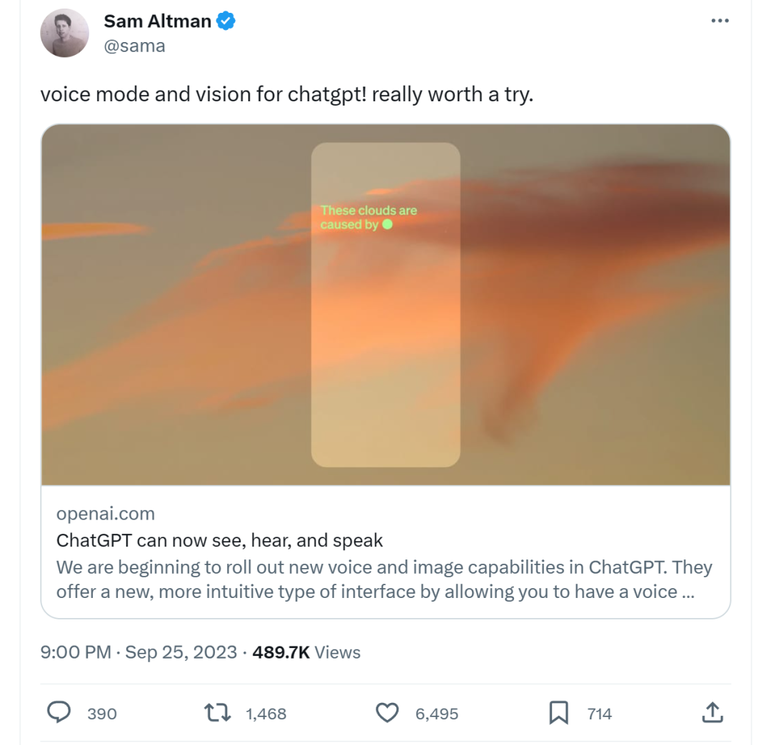 在昨晚,OpenAI CEO Sam Altman 在推特上發布了一條重要消息,ChatGPT 要推出新功能啦。ChatGPT 現在可以看、聽和說了!