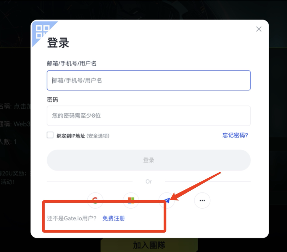 目前Gateio官網(wǎng)有兩個活動,點擊鏈接即可參與,打開頁面后點擊“加入團隊”,在彈出框下面點擊“免費注冊”