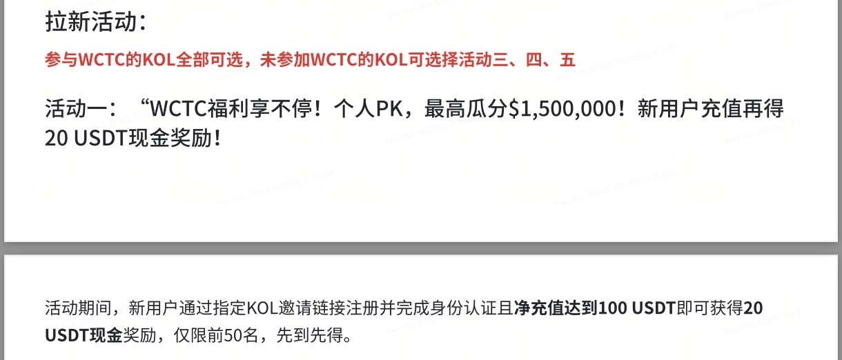 活動一:“WCTC福利享不停!個人PK,最高瓜分$1,500,000!新用戶充值再得20 USDT現(xiàn)金獎勵!