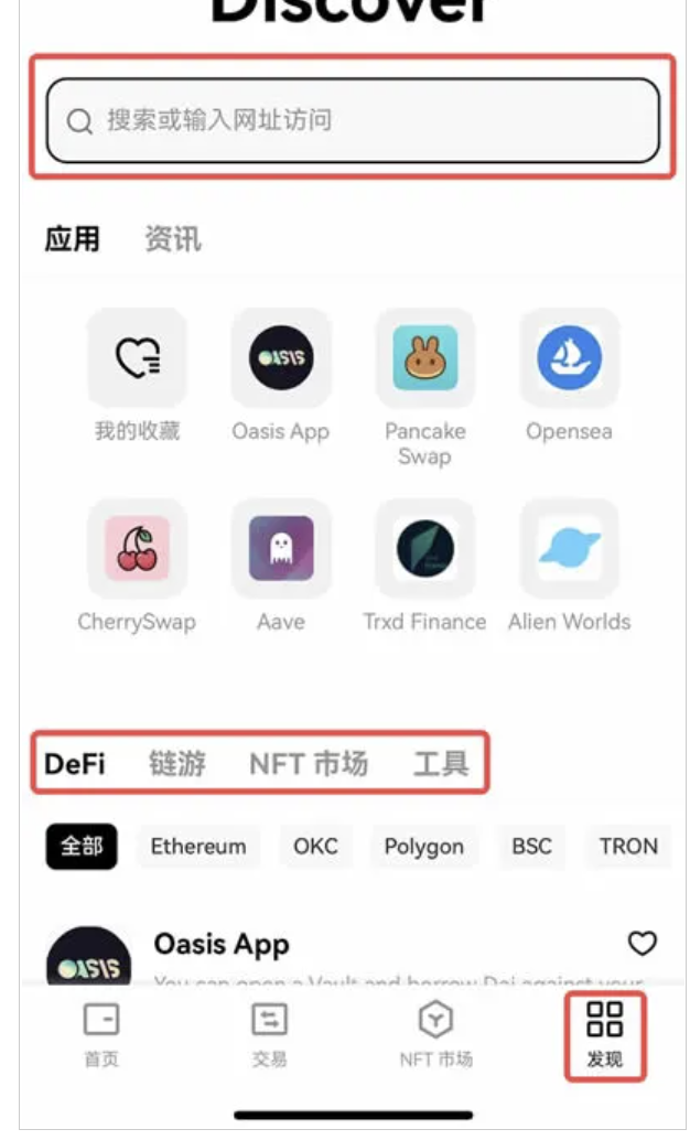 歐易Web3錢包提供了【發現】入口,聚合了海量Dapp接口,其中Web端提供了Dapp相關的用戶、流量、交易量等輔助決策的數據,而App端則以精簡的方式呈現。