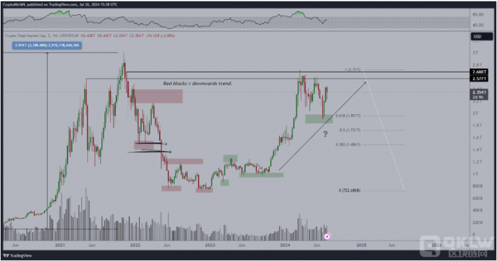 Van de Poppe 分享了一張圖表,顯示crypto的總市值(TOTAL)在建立更高的高點和低點的推動下,處于強勁的上升趨勢。他指出:“crypto的總市值呈現(xiàn)出強勁的看漲圖表。從現(xiàn)在開始的兩到三個月內(nèi),它將超越歷史最高點,并且再也不會回落。將會非常有趣。”