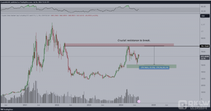 此外,Van de Poppe 還使用 TOTAL3 圖表來研究山寨幣的市值。TOTAL3 圖表跟蹤不包括Bitcoin(BTC),Ethereum(ETH)和穩(wěn)定幣的crypto的整體估值。Van de Poppe 表示,TOTAL3 有望突破8000億美元左右的關鍵阻力區(qū)。