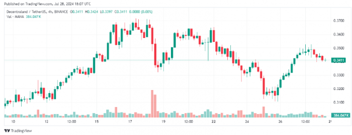 MANA用于購買Decentraland生態(tài)系統(tǒng)中的商品和服務(wù),該生態(tài)系統(tǒng)在2021年底迎來了輝煌時期。當(dāng)時,MANA的價格達到了超過5美元的歷史最高價(ATH),而目前的交易價格約為0.34美元。