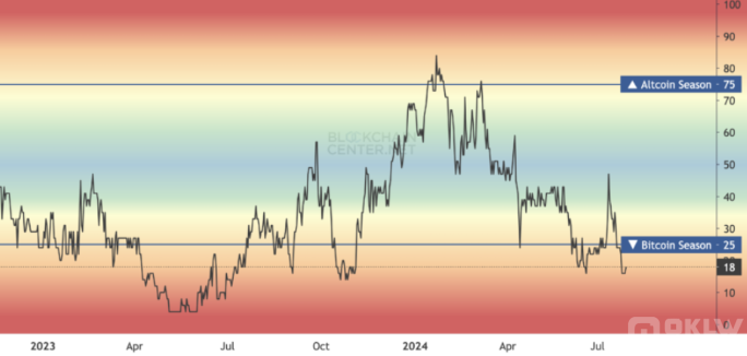 近期,山寨幣市場似乎恢復(fù)了上漲趨勢,但這種增長并未持續(xù)。山寨幣季節(jié)指數(shù)一度僅達(dá)到33,而要確認(rèn)真正的山寨幣季節(jié),該指數(shù)必須達(dá)到75,這意味著前50名山寨幣(不包括穩(wěn)定幣)中至少有75%的表現(xiàn)優(yōu)于Bitcoin。截至目前,該指數(shù)為18,上次達(dá)到這一水平是在6月20日和之前的2023年11月。這表明山寨幣在試圖超越Bitcoin的過程中遇到了困難,而Bitcoin最近繼續(xù)挑戰(zhàn)歷史高點的阻力。