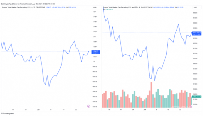 Bitcoin Magazine通過測試TOTAL2和TOTAL3結(jié)論是,無論ETH的表現(xiàn)如何,山寨幣季節(jié)都有可能到來。TOTAL2是排名前125名山寨幣的總市值,而TOTAL3是山寨幣減去ETH和BTC的市值。從數(shù)據(jù)趨勢來看,這兩者的市值趨勢相同,這意味著Ethereum價格可能不會像2021年那樣成為山寨幣季節(jié)的決定因素。