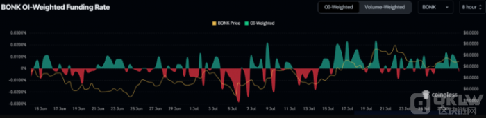 融資利率的變化是當(dāng)前市場情緒的一個重要指標(biāo)。近期,BONK的融資利率已經(jīng)跌至負(fù)值,這表明投資者對未來價格走勢缺乏信心。負(fù)資金利率通常反映出市場的悲觀預(yù)期,表明投資者不愿意持有該資產(chǎn),甚至愿意支付費(fèi)用以擺脫其持倉。