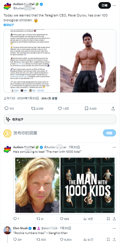 埃隆·馬斯克也是生孩子的狂熱愛好者,他發(fā)推文回應(yīng)了杜羅夫的爆料:“新手數(shù)據(jù)”,他提到了成吉思汗,他與近 500 名妻子育有 100 多個孩子。馬斯克本人是12 個已知孩子的父親,不過不是通過精子捐贈。